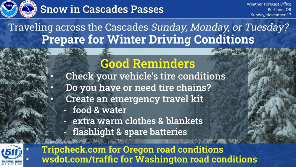 冬季风暴警告在喀斯喀特山脉和山脉山麓地区有效至周一晚上10点。美国国家气象局警告,海拔2,000英尺以上的地区将出现大雪,海拔1,500英尺以上的地区也可能降雪,预计胡德山滑雪胜地将迎来超过两英尺的积雪,山口地区降雪量将超过8英寸。