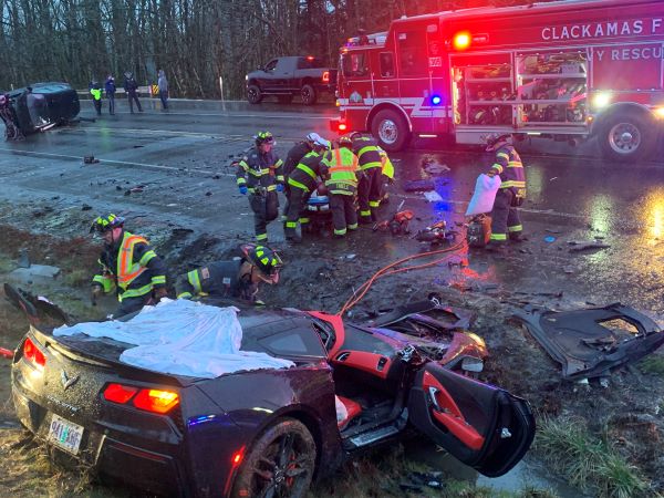 克拉克马斯县(代表城市:Happy Valley)消防局说,相撞的两辆汽车严重受损,救援人员赶到现场时不得不把司机从车里拖出来。