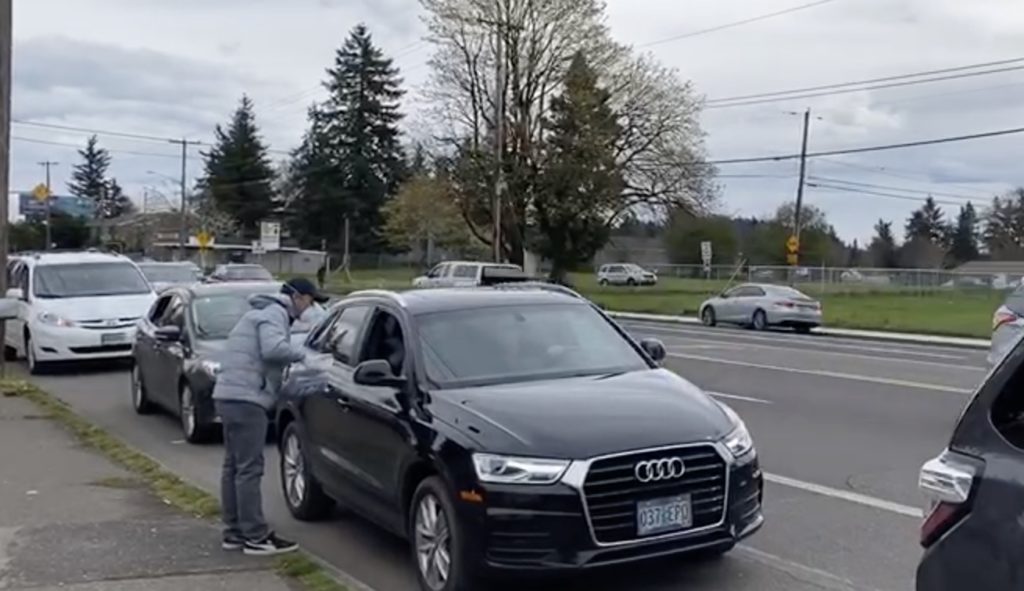 当日,浩浩荡荡的乡亲车队从海宴公所会址经过,海宴同乡会的职员们在那里负责派送。乡亲们只需要打开车窗就能领取,无需下车。场面壮观,和谐,温馨,又欢乐!