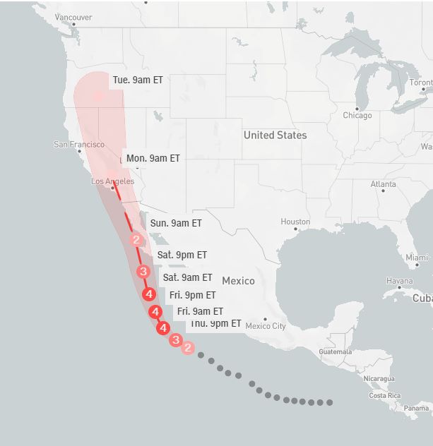 飓风希拉里可能会达到4级飓风,风速至少为130英里(209公里)每小时,预计未来几天将给南加州和美国西南带来“重大”影响!