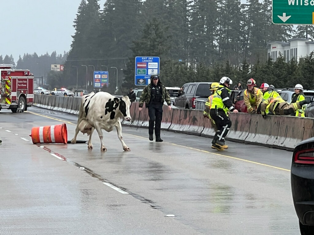 赶到现场的州警察、州交通部和当地的Tualatin消防救援组织合力将奶牛赶到高速公路的出口,努力将它们送上另一辆卡车。