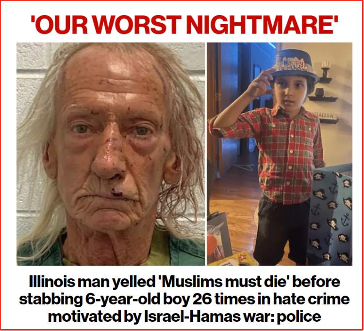 美联社报道说,受以色列哈马斯战争的影响,71岁的芝加哥效区男子楚巴(Joseph M. Czuba)10月14日星期六冲进美籍巴勒斯坦人的住宅,杀死一名6岁的美籍巴勒斯坦男孩,重伤男孩的32岁母亲。