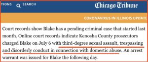 根据芝加哥媒体的报道,黑人男子Jacob Blake犯有虐待、性侵、非法入室、和其他违法行为,正被法院通缉。