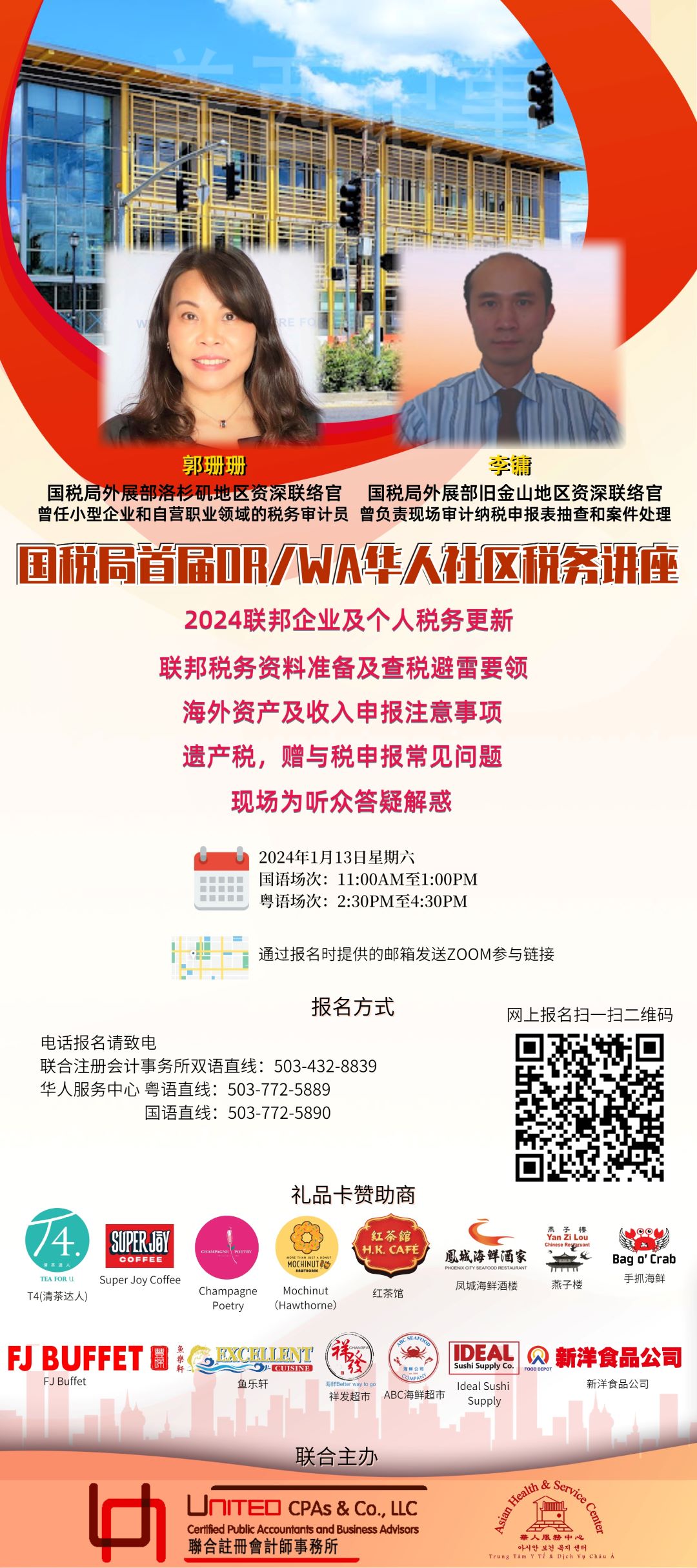 受俄勒冈州波特兰联合注册会计师事务所创办人张丹丹会计师的邀请,联邦国税局税务专员郭珊珊(Susanne Guo)和李镛(Yong Li)原计划在波特兰举行面对面的讲座。