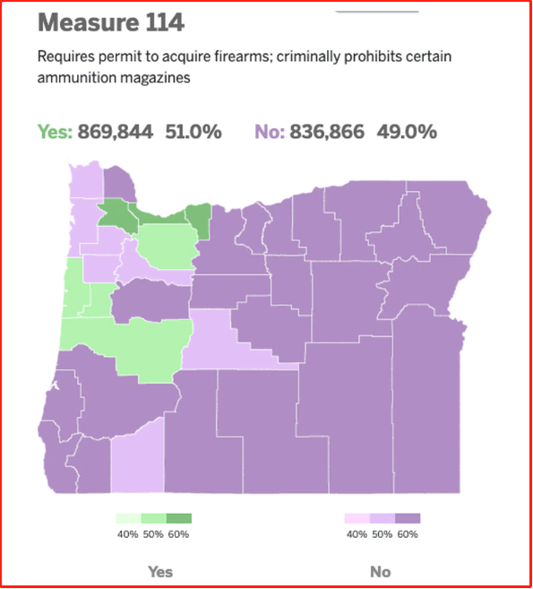 俄勒冈州史上最严厉的控枪提案《114》在刚刚结束的中期选举中获得了51%的赞成票,49%的反对票,微弱通过。
