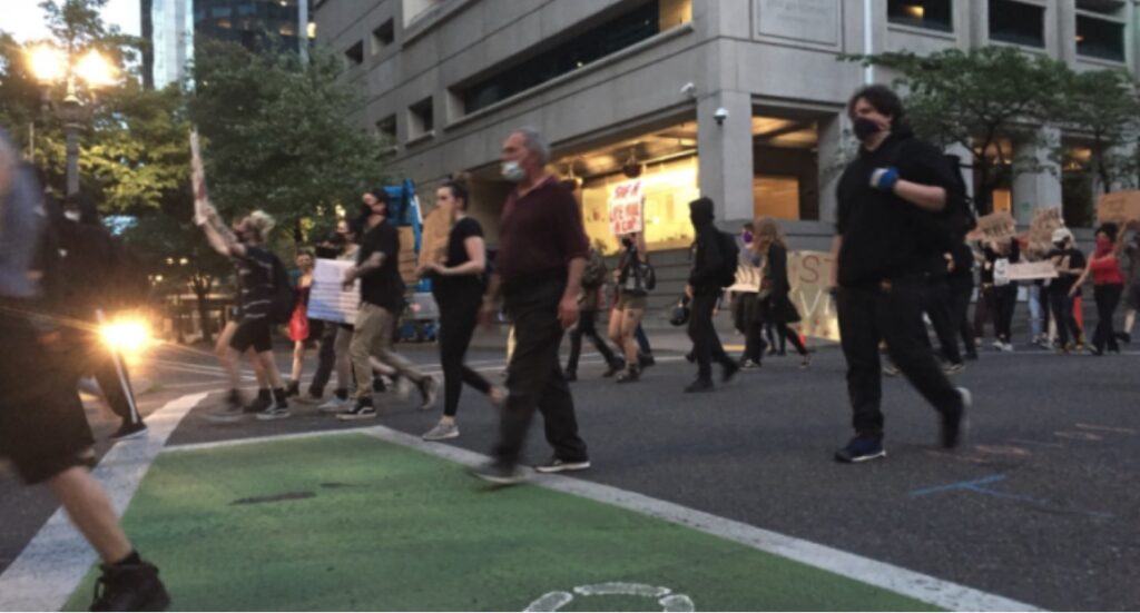 在波特兰!同样发生抗议示威。星期四晚上,激进组织PNW青年解放阵线组织了一个守夜活动,以表示声援明尼阿波利斯抗议者,要求“伸张正义”。70至80人聚集在摩特诺玛县司法中心,然后向北行进至SW 3rd Avenue。