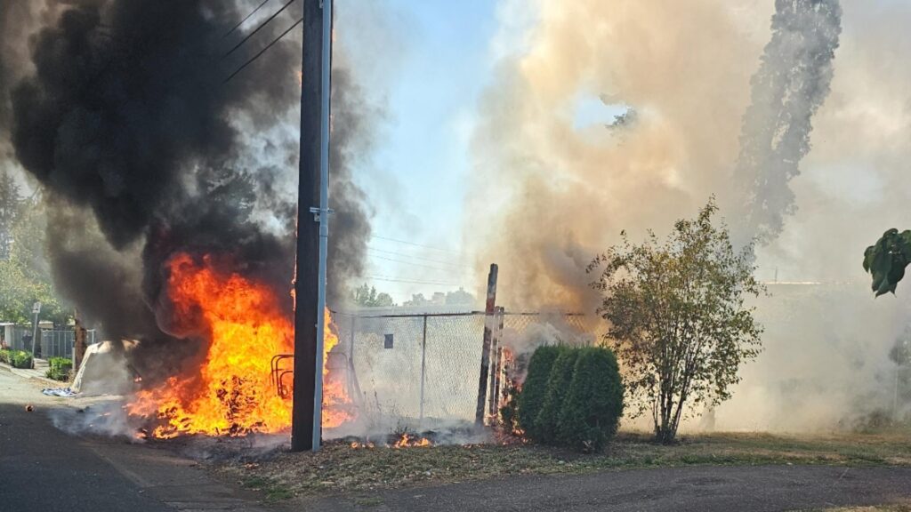据波特兰消防救援队 (PF&R) 称,火灾始于东北 100 街 100 号街区的一个无家可归者营地,但已被扑灭。