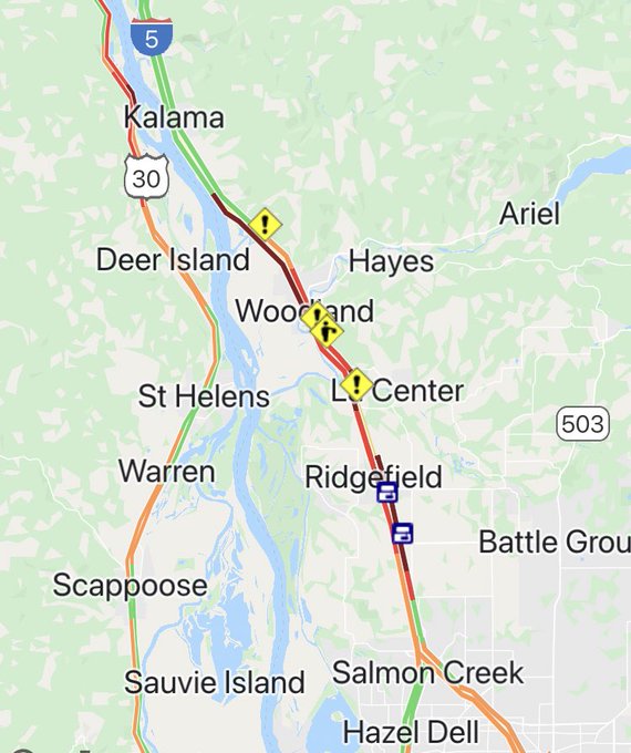 - 司机避开 La Center 和 Woodland 之间的 5 号州际公路,那里多辆车无法行动。