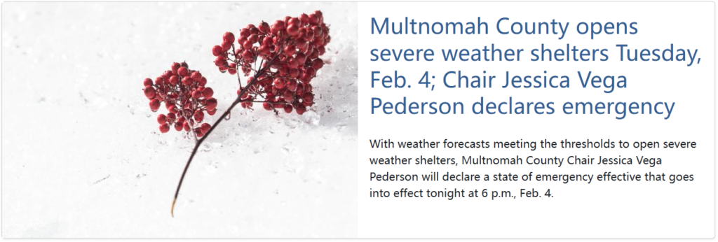 随着波特兰地区气温降至冰点以下,摩特诺玛县政府宣布将开放三个严寒避难所,为无家可归者提供御寒避难。