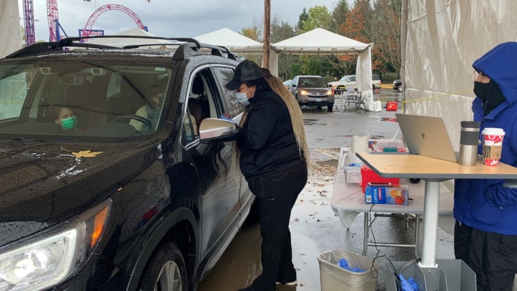 11月6日,大约450名5至11岁的儿童在波特兰Oaks Park公园接种了新冠疫苗。