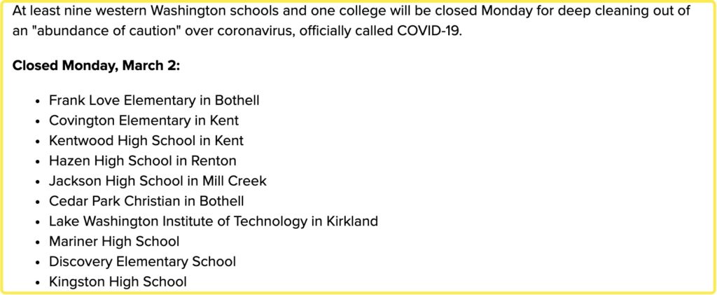 据媒体报道,星期一,华盛顿州西部至少9所学校因担心新冠而停课消毒。