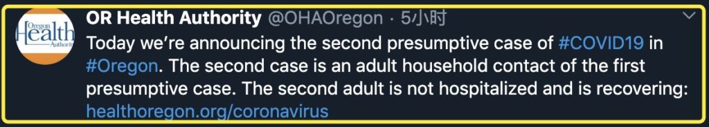 (翻译兼原创)3:00pm同步更新!俄勒冈州卫生局周日晚上宣布了该州第二例冠状病毒推定病例、周一又确诊第三例!华盛顿州大西雅图区也出现第二例新冠患者死亡!纽约州首次染色!