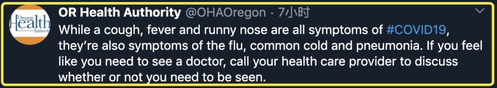 最后,回到我们俄勒冈州。俄勒冈州卫生局提醒居民,咳嗽,发烧和流鼻水都是新冠的症状,但它们也可能是流感、普通感冒和肺炎的症状。如果您感觉需要看医生,请致电您的医疗保健提供者。
