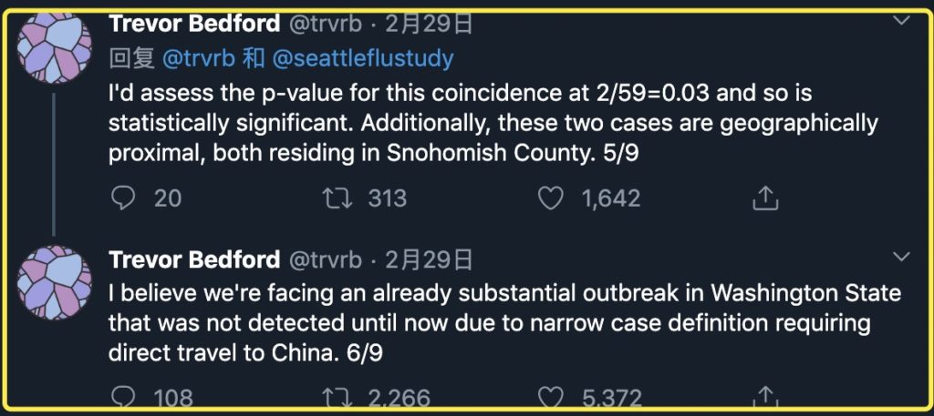 西雅图生物学家特雷弗·贝德福德在推特上称,在华盛顿州,我相信我们已经面临爆发的疫情。
