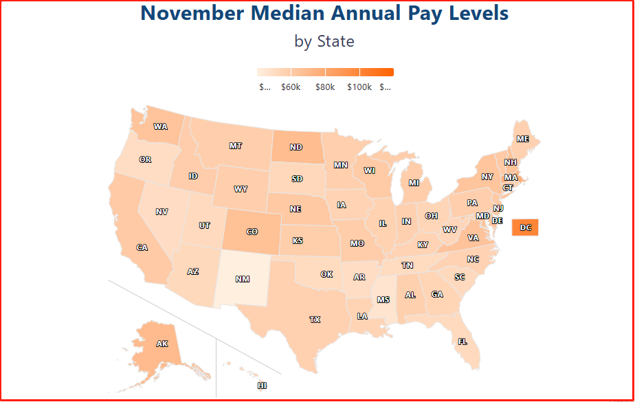 数据显示,华盛顿特区的年薪中位数最高,达到100,400美元,其次是马萨诸塞州(75,800美元)、阿拉斯加(69,600美元)、北达科他州(68,500美元)和科罗拉多州(66,300美元)。