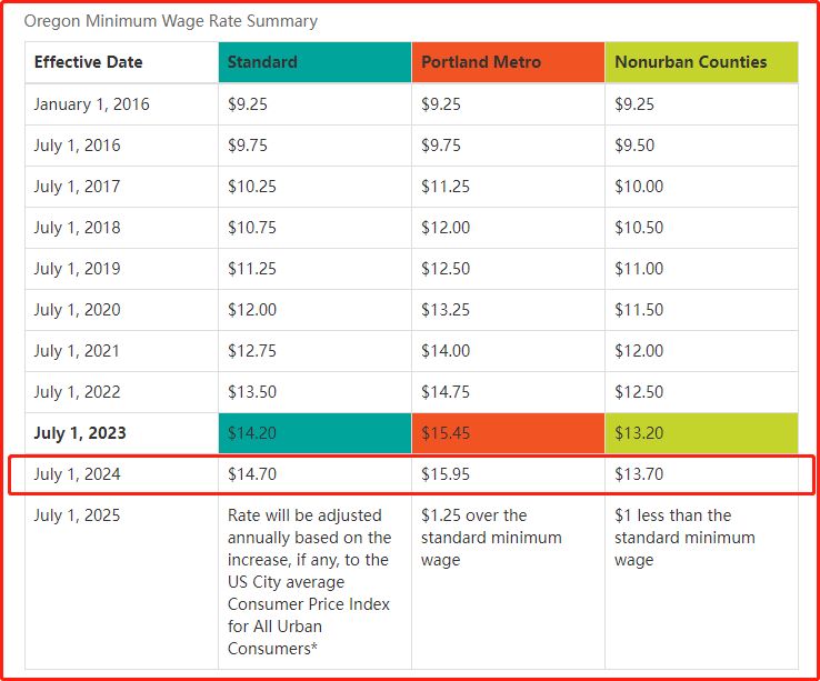 俄勒冈州劳工和工业局(Oregon’s Bureau of Labor and Industries)宣布,2024年7月1日起,波特兰地区的最低工资涨至每小时15.95美元,波特兰地区以外的市县最低工资升至每小时14.70美元,农村地区最低工资为13.70美元每小时!