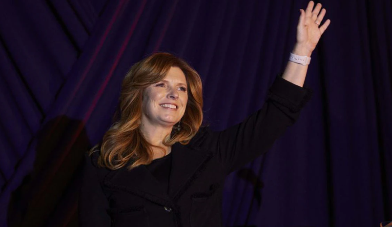 俄勒冈州共和党州长候选人 Christine Drazan 于 2022 年 11 月 8 日星期二在俄勒冈州西尔弗顿市向支持者挥手致意