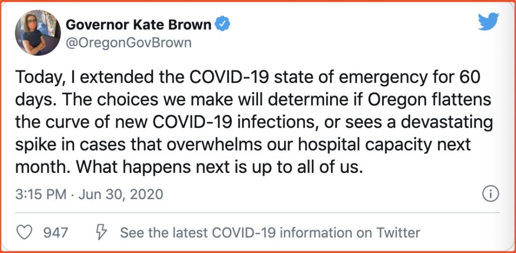 6月30日星期二,俄勒冈州州长布朗宣布延长“全俄勒冈紧急状态”至9月4日,此紧急状态令从2月7日持续到现在。再次延长,是因为新冠病毒激增!