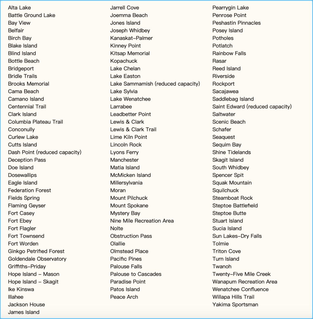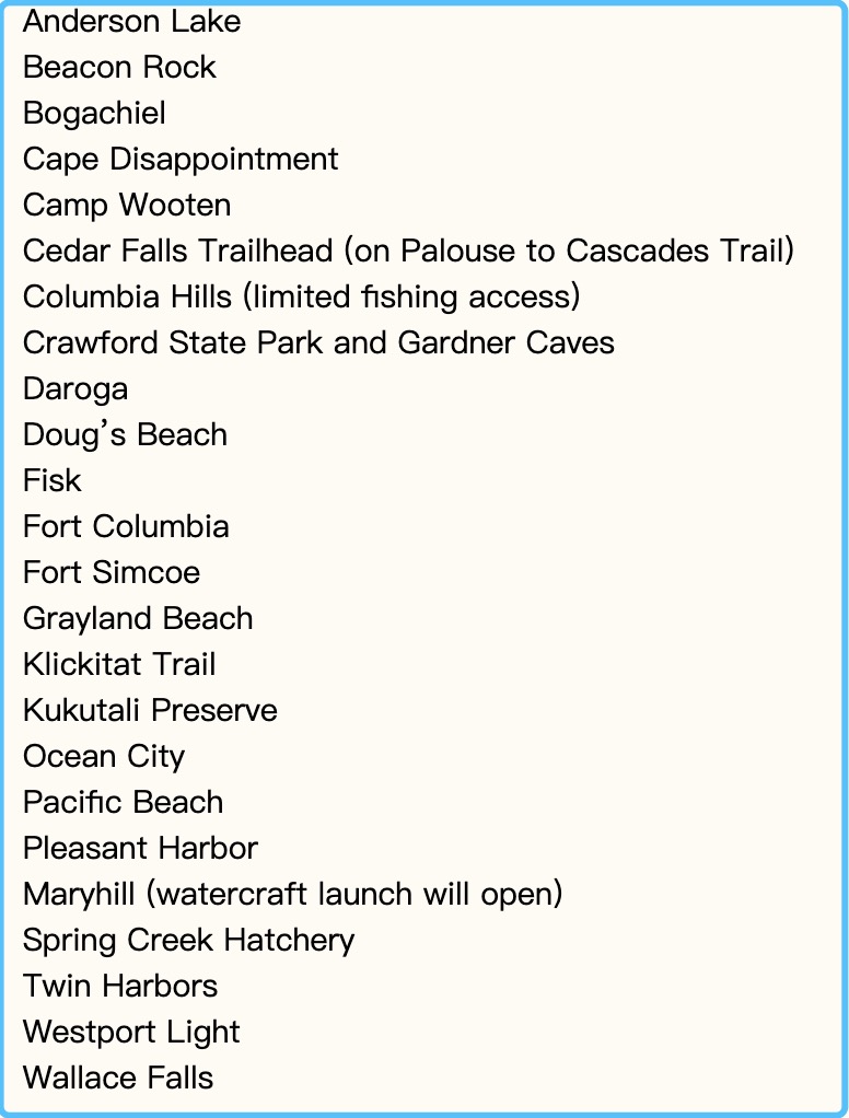5月2日星期六,华盛顿州宣布,将在星期二开始重新开放超过100个州立公园供日间使用。但是,一些州立公园包括所有海滩和Columbia River Gorge公园将仍然关闭。