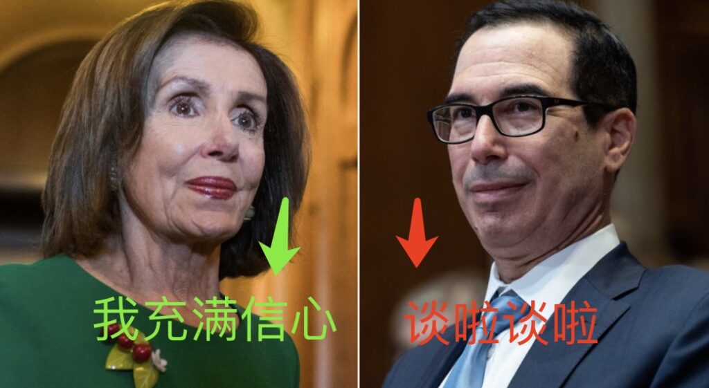 众议院议长佩洛西接受媒体CNN采访时说:“我相信财政部长可以找到办法达成协议,我充满信心!”