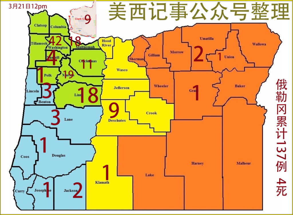 俄勒冈州3月21日星期六午间,累计新冠病例上升到137例,累计死亡4例!