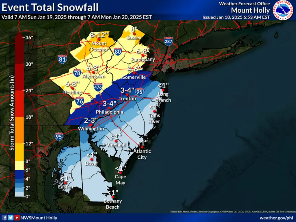 - 新泽西北部部分地区可能迎来多达10英寸(约25厘米)的积雪。