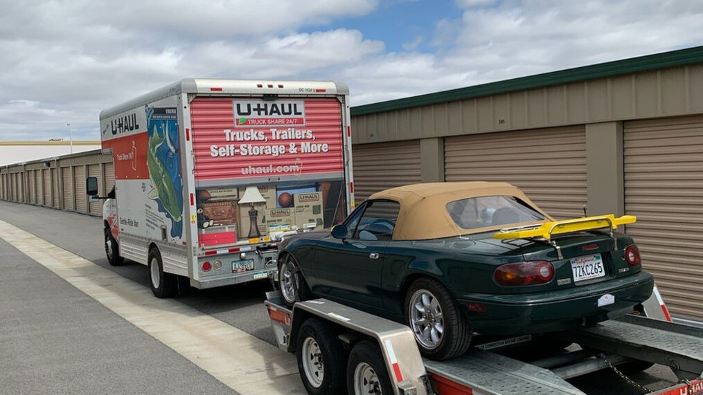 卡车装着这对夫妇拥有的大部分东西,家具、衣服、工具、情感物品等。卡车后面有拖车,拖车上面是一辆马自达小车。