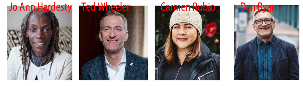 从左到右是 Jo Ann Hardesty,Ted Wheeler,Carmen Rubio,Dan Ryan
