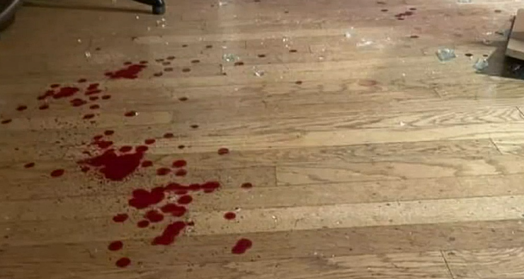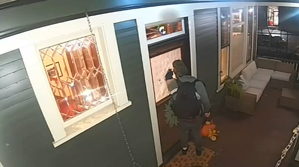 父亲跑到门口,看到嫌疑人正在破坏他们的大门的玻璃。
