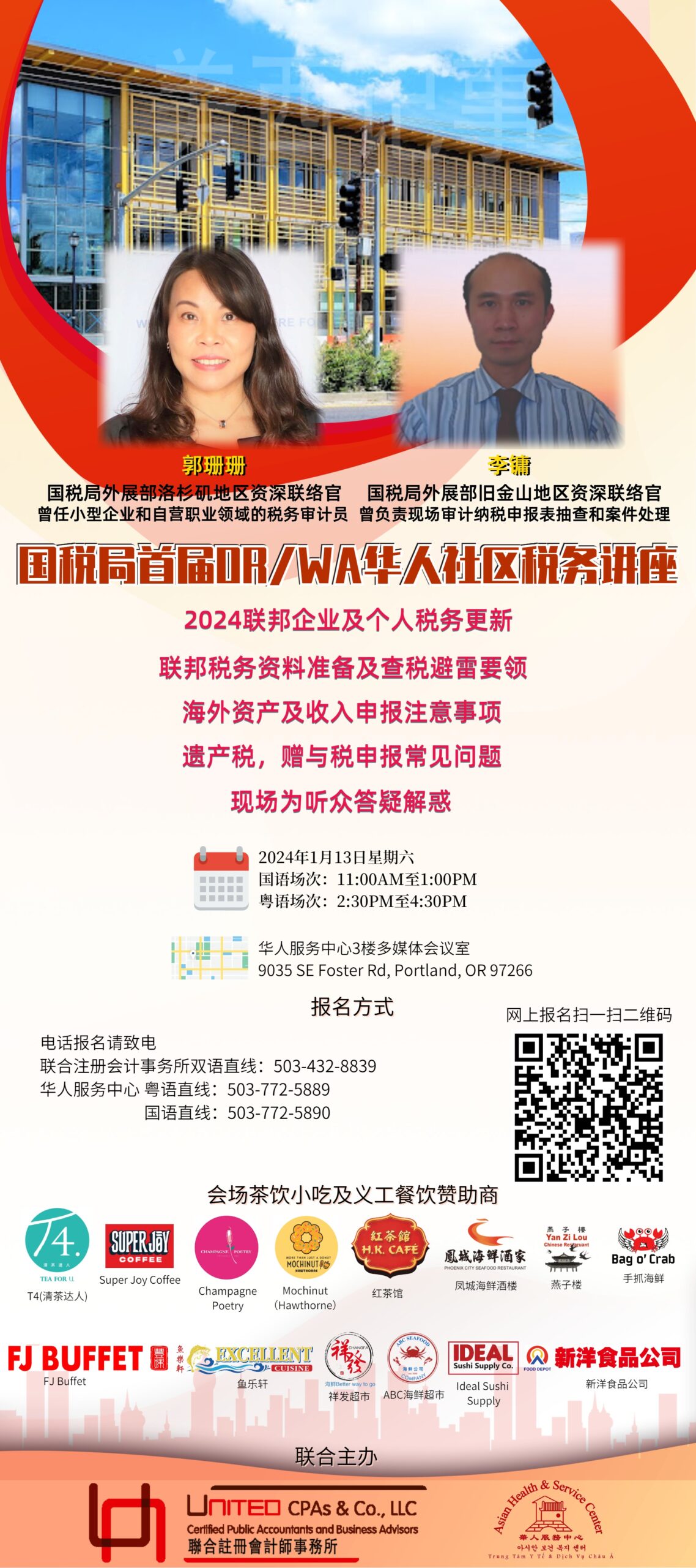 2024年1月13日,受俄勒冈州波特兰联合注册会计师事务所创办人张丹丹会计师的邀请,联邦国税局税务专员郭珊珊(Susanne Guo)和李镛(Yong Li)将在波特兰华人服务中心举办两场大型的国语和粤语的税务讲座,欢迎波特兰地区所有华人参加!