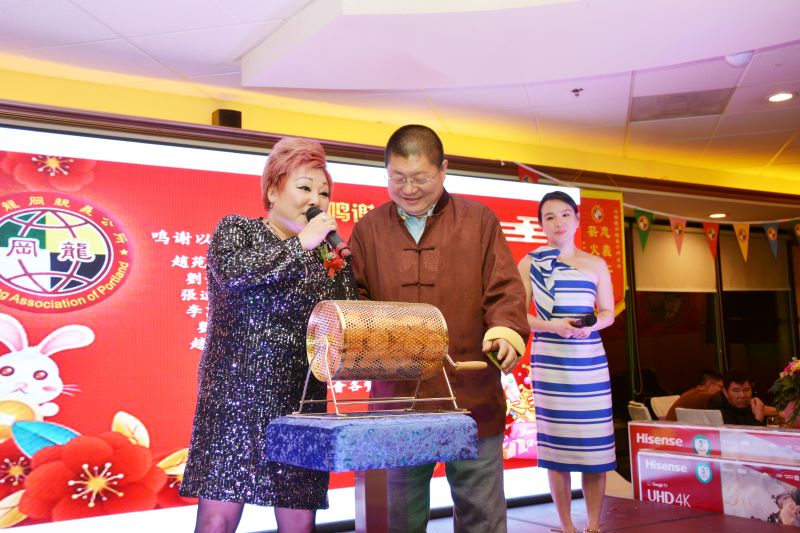 俄勒冈副州务卿谢丽尔·迈尔斯(Cheryl Myers)在中国联谊会前主席华盛顿州华人联合会董事会主席黎观城陪同上台传译下说:龙冈公所自一百多年前成立,可以想像得到要多少代人的辛勤耕耘,不懈努力才能传承和发展至今,她期望公所越办越兴旺,并祝愿大家新年快乐。