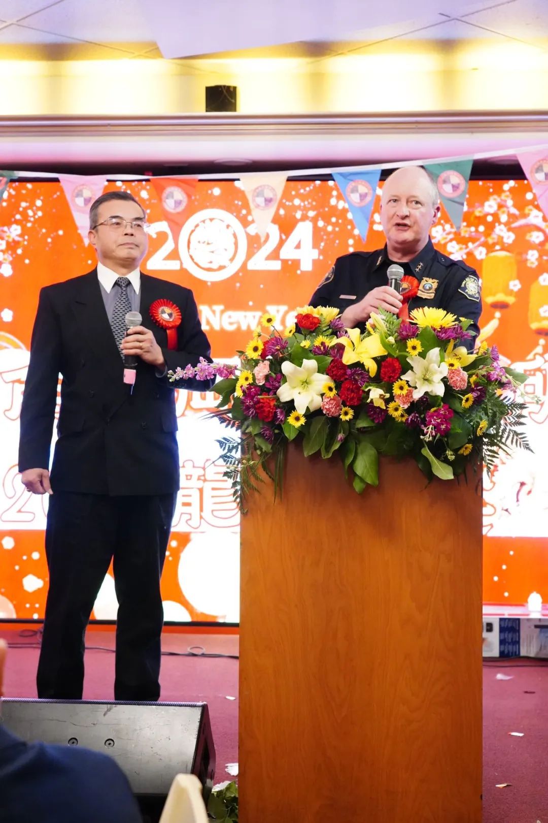波特兰警察局副局长迈克·弗罗姆(Mike Frome)也上台致辞,期望龙冈亲义公所越办越兴旺,并祝愿华人新年快乐。