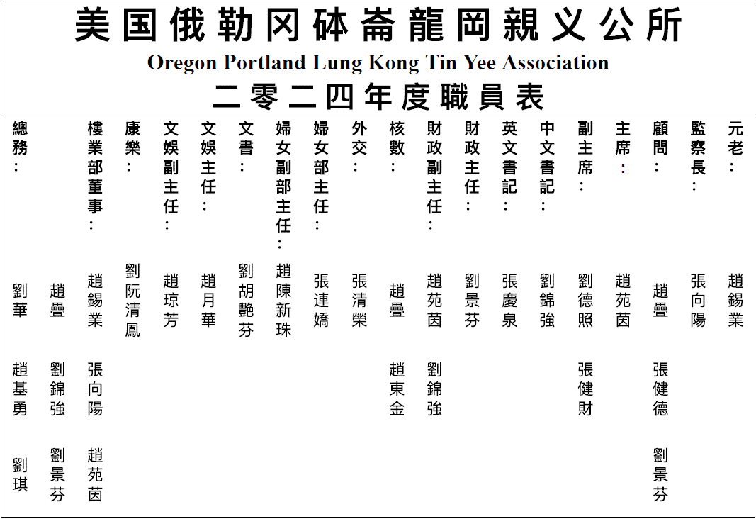 宴会上,钵仑龙冈亲义公所中文书记刘锦强还向大家介绍了波特兰龙冈亲义公所的全体职员。