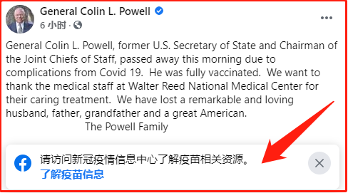 鲍威尔(Colin Powell)的家人通过FaceBook宣布了他的死讯,并指出鲍威尔曾全面接种了新冠疫苗。