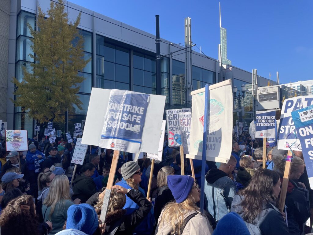 在11月8日那一天,波特兰教师协会带领1000多名抗议者包围了俄勒冈会议中心(Oregon Convention Center)。