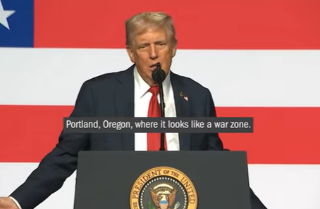 特朗普在演讲中谈及与俄勒冈州长科特克(Tina Kotek)的对话,称自己在看到画面后反问:“你们的城市看起来像二战现场,你们说一切都在掌控中?你们一定是在开玩笑。这地方就是一场噩梦,非常残酷。”