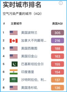 由于连续多日的特大野火火灾,美国西部主要城市均登上世界空气质量最差前列。俄勒冈州波特兰当仁不让,仍然稳居世界第一名,第一名最差。