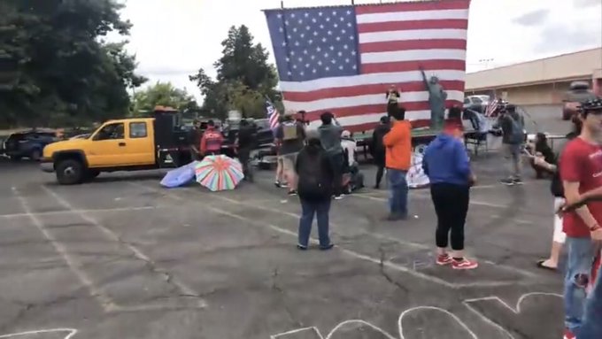 原计划也在海滨公园举行“爱之夏”爱国主题集会的右派人士(共和党支持者)改变了计划,2点左右,100多人集中到波特兰东北122大道的K-Mart商店的停车场,在那里演讲。有些人穿着战术背心,有些人穿着与骄傲男孩相关的服装。