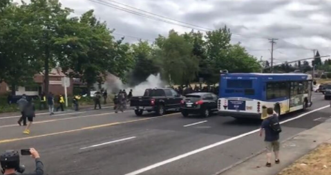 4点左右时,在海滨公园的左派示威者抵达K-Mart停车场。英文媒体记者看到有人开面包车撞向停车场,司机跳下扔自制炸药。局势迅速升级,双方开始冲突、放烟花、互喷胡椒!
