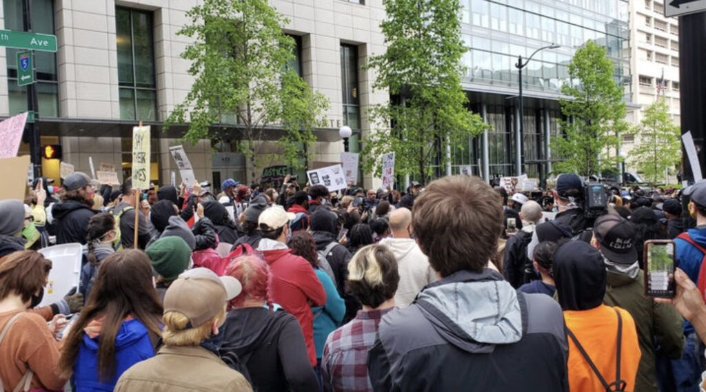5月30日星期六,原计划于下午3点在西雅图市中心Westlake Center购物城举行的抗议示威,但在下午2时就已经聚集了超过1000人!