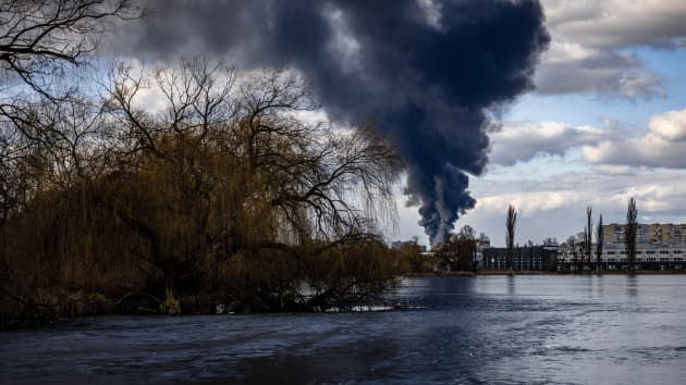 2022 年 2 月 27 日,在俄罗斯对一个油库发动一夜空袭后,基辅郊外的瓦西尔基夫镇上空冒出浓烟