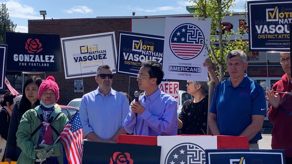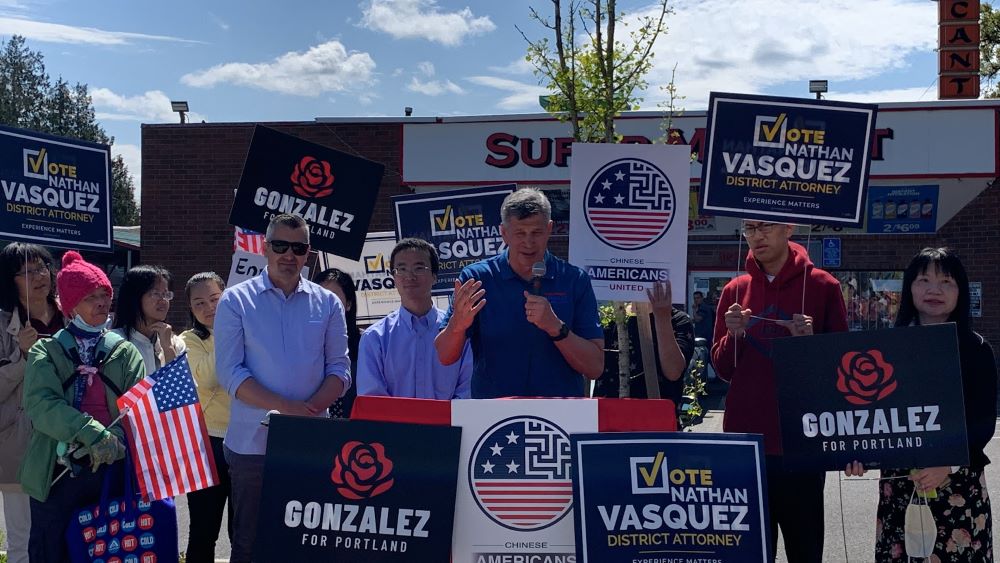4月14日星期日中午12点,俄勒冈州波特兰数百名华人集合在东南区82大道夹Division街,表达对波特兰市长候选人雷内·冈萨雷斯 (Rene Gonzalez)和摩特诺玛县(Multnomah)地区检察官候选人内森·瓦斯奎兹(Nathan Vasquez)的坚定支持,诉求重建安全波村!