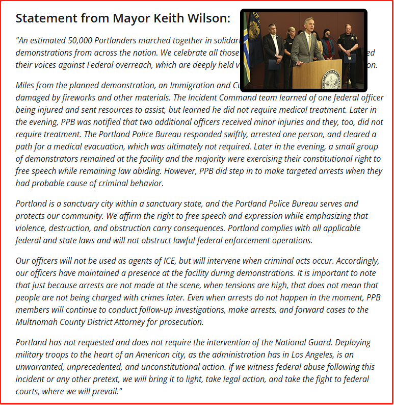 波特兰市长基思·威尔逊(Keith Wilson)15日就ICE事件发表声明: