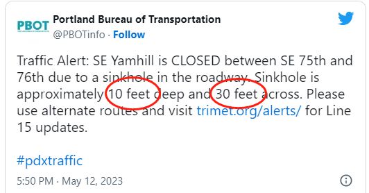 5月12日星期五下午5点50分,波特兰交通运输局报告,波特兰东南区76大道夹Yamhill街出现一个天坑。