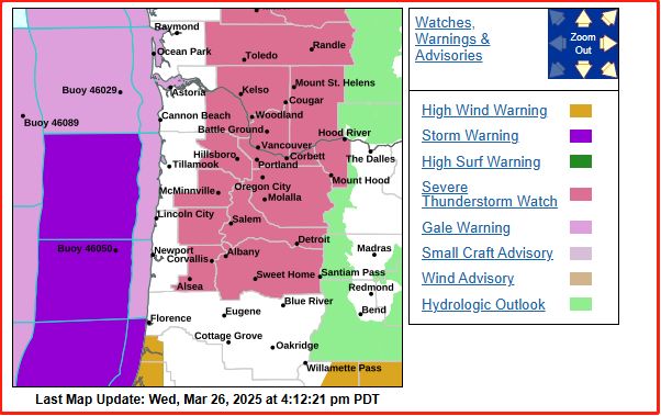 美国国家气象局风暴预测中心于3月26日下午3时10分发布严重雷暴监测预警,该预警将持续至当晚9时,覆盖俄勒冈州和华盛顿州部分地区。