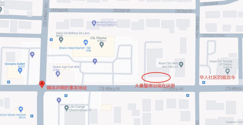 媒体不约而同的把事发地址称为“东北第162大道夹Glisan街”,但警察集中并拉开警戒线的地方是“东北第164大道夹Glisan街”,是在华人社区的观音寺的对面。