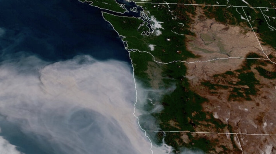 最新消息,卫星图像显示,截至星期二中午,来自加州的野火烟雾在俄勒冈州海岸向北移动,预计晚上7点左右到达华盛顿州大西雅图地区。
