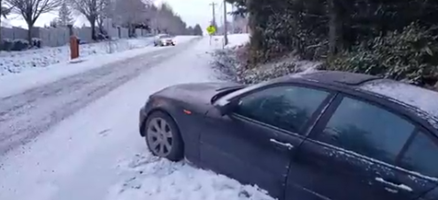 KGW记者在比弗顿Rigert Road以南的175大道看到一辆车陷入路边,过往车辆则以S型的姿势危险滑过。当地已经要求汽车上雪链。