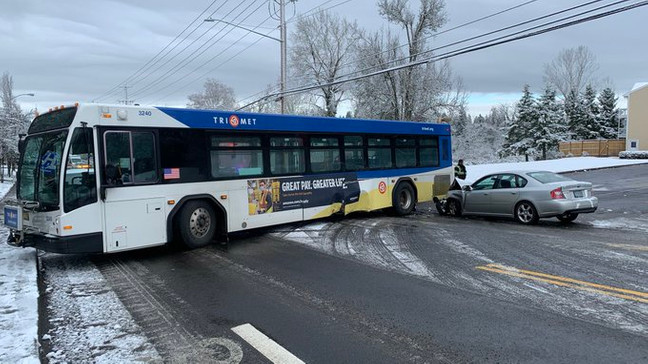 在Tualatin的65大道,一辆公交车和一辆汽车相撞。一名受轻伤的人被送往医院。