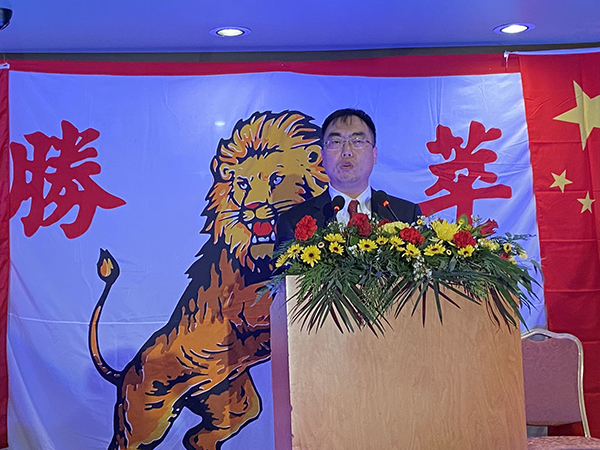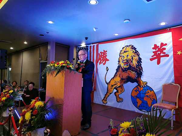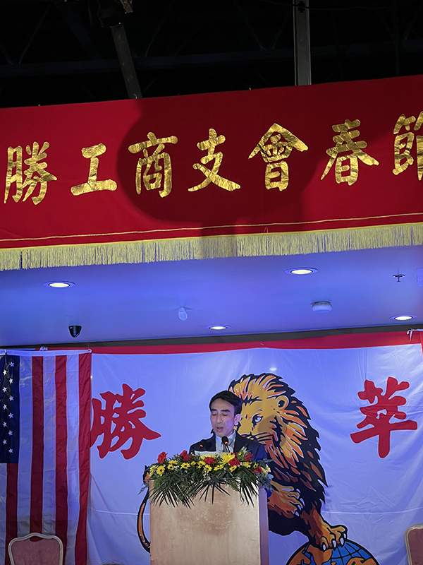 然后,中国驻旧金山总领馆领侨处王一鸣主任发表致辞。王一鸣主任在致辞中首先代表总领馆总领事张建敏大使向各位侨胞致以节日问候,并祝福广大侨胞身体健康!家庭幸福!萃胜工商会会务昌隆!王一鸣主任在讲话中提到,希望大家积极参与中国发展、民族复兴、促进中美交流。